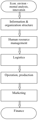 M. Porter’s value chain theory emphasizes the importance of business processes. A Porter’s value chain is a raw of activities or business units at firms. A business unit is the appropriate level for construction of a value chain, not at the divisional level or corporate level. Products pass through all activities of the chain in order, and at each activity the product gains some value. The chain of activities in a specific order gives the products more added value than the sum of added values of all activities.