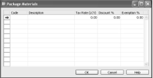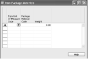 This way it is simple to prepare the accounting of product charge for that case when the liability arises from the purchase. In the “Item Package Materials” table we can enter the internal code of the chargeable product, the internal item unit of measure code (e.g. kg), then the package material code referring to the “Package Material” table (using the "look up" menu), and the quantity of the item unit of measure.